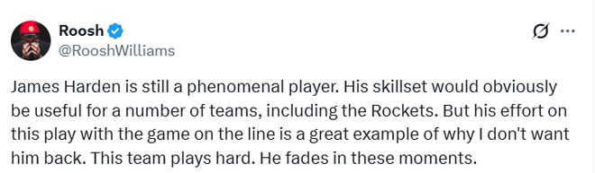 火箭记者Roosh Williams也在社媒上谈到此事。”詹姆斯-哈登依旧是一名极具天赋的球员。他的技术能力显然能为多支球队提供助力,火箭队也不例外。但在这场比赛的生死时刻,他在那个关键回合里的拼劲,恰恰印证了我为什么不希望他回归 —— 这支火箭队的球员个个全力以赴、奋勇拼搏,而他却在这样的紧要关头总是掉链子。”